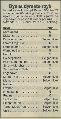 - Ja, jeg reagerte med en gang da jeg fikk høre prisen. Åtte kroner er jo veldig dyrt for en sigarett. Jeg trodde fem kroner var vanlig pris på byen. Vi betaler jo nok avgift på røyken allerede, om ikke utestedene skal flå oss i tillegg.